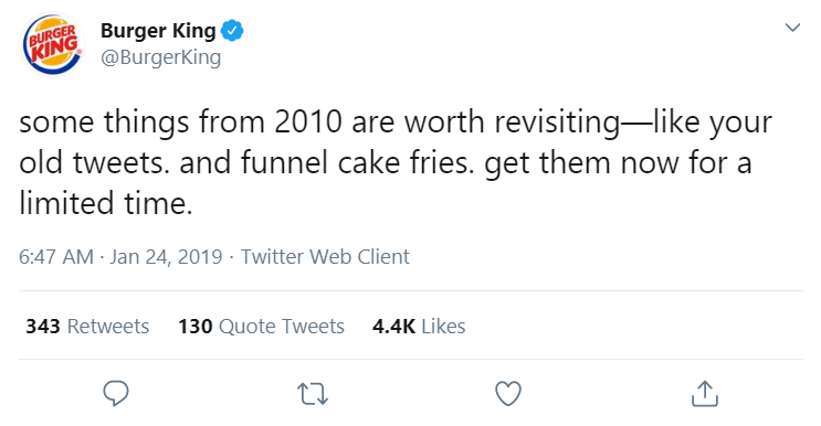 كمثال ، انظر إلى حملة اجتماعية حديثة من برجر كنج. لقد تجولوا في Twitter مع الإعجاب بتغريدات عمرها 10 سنوات على العديد من حسابات المؤثرين. وكما هو متوقع - خرج هؤلاء المؤثرون يسألون برجر كنج عن ذلك.