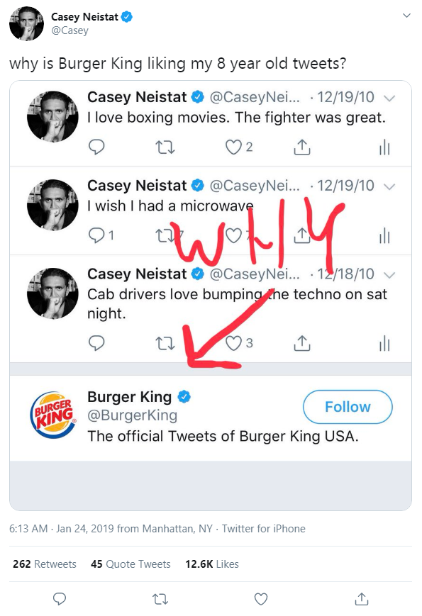 قبل أن تنظر إلى المشاركة في هذه التغريدة وتشعر بالحزن على برجر كنج لأنه بذل كل العمل مقابل القليل جدًا - ضع في اعتبارك أن Casey Neistat قام بعمل فيديو كامل به 3 ملايين مشاهدة والعد.