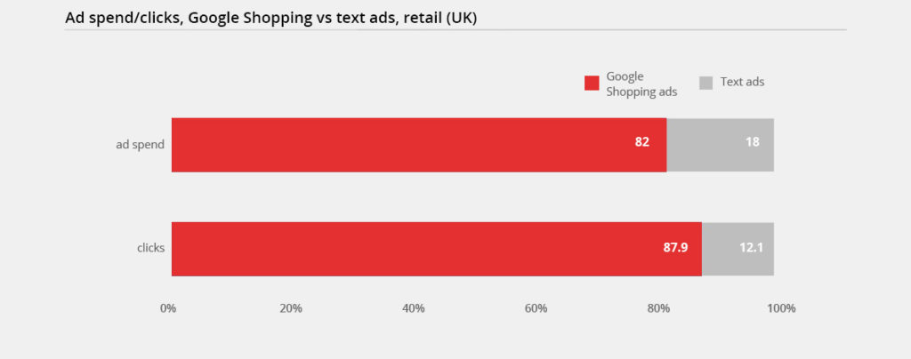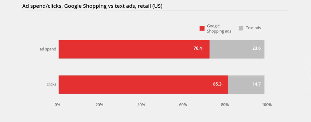 لعدم الإدلاء ببيانات لا أساس لها ، نود أن نشارك معك بعض البيانات من Adthena Search Advertising Report ، Q1 2018. يقولون أنه على الرغم من حقيقة أن الإعلانات النصية المدفوعة لا تزال هي الشكل السائد للإعلان ، فإن الشركات الأمريكية اليوم تخصص 76.4٪ من إجمالي ميزانيات البحث للبيع بالتجزئة على إعلانات Google Shopping في المتوسط ، وتحصل على أكثر من 85٪ من النقرات.