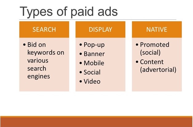 شبكات الإعلانات ، على سبيل المثال ، تقدم أشكالًا متعددة من الإعلانات عبر شبكتها. تهيمن Google و Facebook على سوق الدفع لكل نقرة ، ولكن لا يزال هناك مجال للشبكات الأقل شهرة مثل ePair Media أو AppNexus لتصبح مهيمنة في المستقبل. على سبيل المثال ، تعمل الإعلانات التي يتم عرضها من خلال Google بشكل عام على أساس تكلفة النقرة ؛ حيث يتم تحصيل رسوم منك فقط عندما ينقر شخص ما على إعلانك. غالبًا ما يكون الإعلان المدفوع أكثر قابلية للتنبؤ به من الإعلانات المجانية: إذا أنفقت 10 دولارات أمريكية على حملة إعلانية وحصلت على 50 نقرة ، فمن السهل توقع أنك إذا أنفقت 100 دولار ، فستحصل على 500 نقرة.