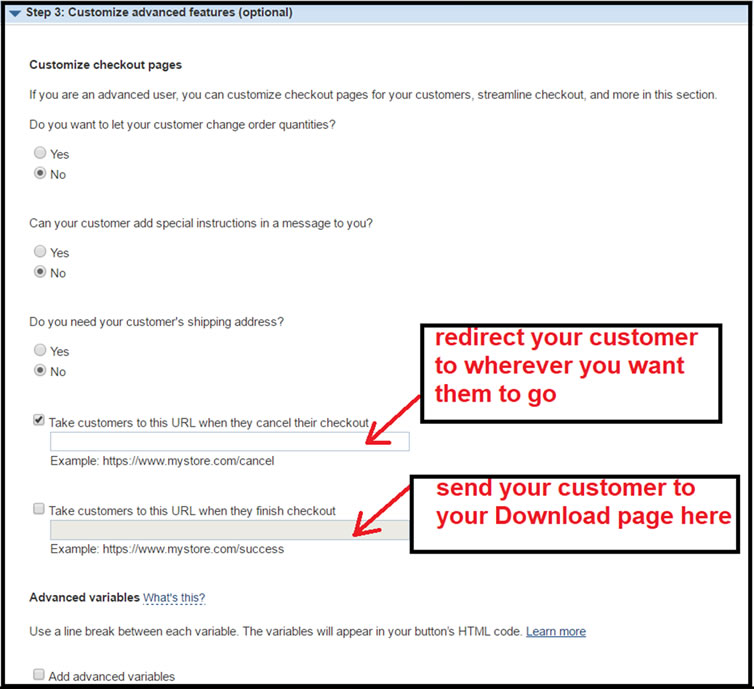 في الخطوة 3 ، ستجيب أولاً على 3 أسئلة باختيار "نعم" أو "لا" (اختر "لا" لجميع الأسئلة الثلاثة!) ثم سيُطلب منك تقديم عنواني URL ... أحدهما "لنقل العملاء إلى عنوان URL هذا عندما ألغوا عملية الدفع الخاصة بهم "وواحدًا" لنقل العملاء إلى عنوان URL هذا عند الانتهاء من عملية الدفع ".