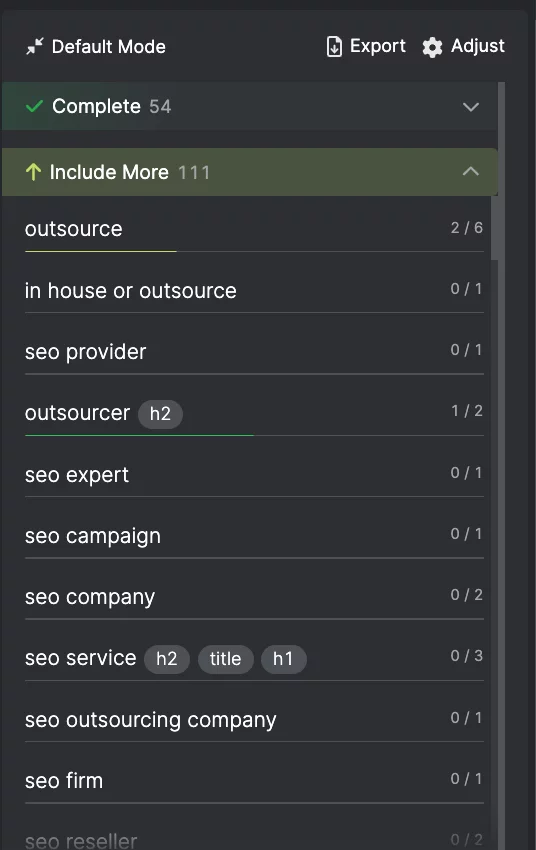 سيقترح برنامجنا شروط تركيز قوية لتضمينها. سيؤكد أيضًا ما إذا كانت العناصر الموجودة على الصفحة وتردد الكلمات الرئيسية التي تحتاجها لكل قطعة. من خلال تحسين نقاط المحتوى الخاصة بك ، سوف تقوم بتحسين إمكانات التصنيف الخاصة بك.
