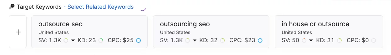 بمجرد إدخال كلماتك الرئيسية ، ستوفر لك الأداة أيضًا كلمات رئيسية مقترحة لاستهدافها بناءً على الصلة الدلالية. انقر فوق "+" لإضافة أهداف الكلمات الرئيسية هذه إلى قائمتك.