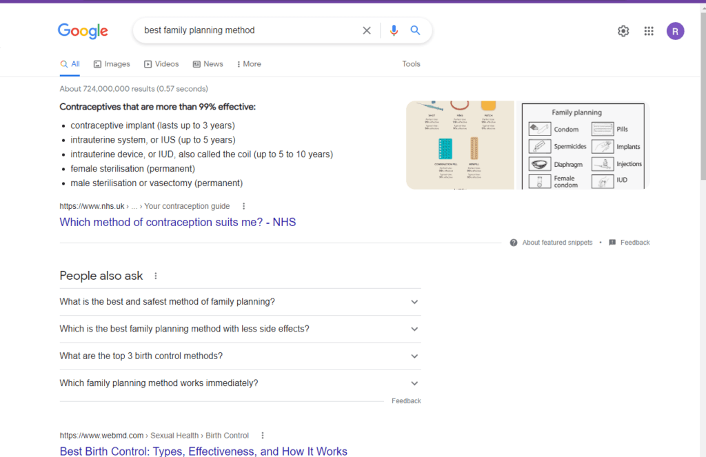 - قم بعمل قائمة بالأسئلة الشائعة في مجال تخصصك. تعرض لك علامة التبويب "الأسئلة" في بحث MarketMuse الأسئلة ذات الصلة التي يطرحها المستخدمون عند البحث في هذا الموضوع. خلاف ذلك ، ستحتاج إلى القيام بذلك يدويًا. تحقق من الأسئلة ذات الصلة في قسم الأسئلة الشائعة وعمليات البحث ذات الصلة و "الناس يسألون أيضًا" وأنشئ قائمة بالأسئلة الأساسية. على سبيل المثال ، من خلال التحقق من الصورة أدناه ، بحثت عن "أفضل طريقة لتنظيم الأسرة" ، ويمكنك مشاهدة مقتطف مميز. يمكن أن يساعدك إنشاء قائمة بأكثر وسائل منع الحمل فعالية في الفوز بالمقتطف.