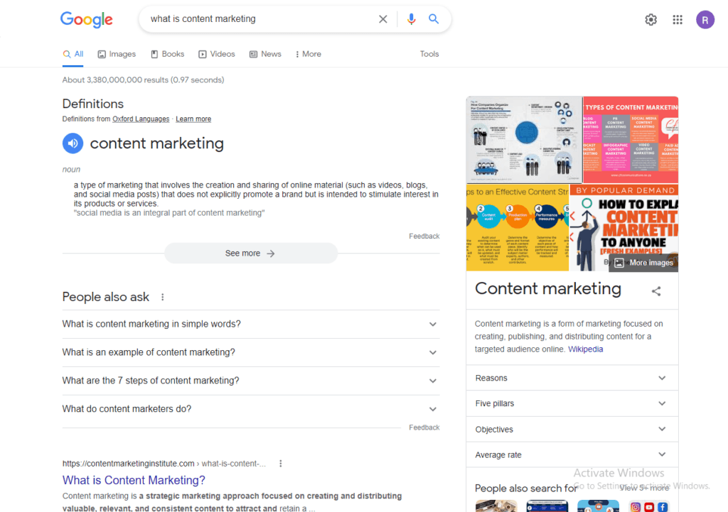 على سبيل المثال ، ابحث عن "ما هو تسويق المحتوى؟" على Google وستظهر عدة عناصر. تظهر أربعة إعلانات مدفوعة في الجزء العلوي الأيسر من الصفحة ، مما يمنحها عرضًا أوليًا.