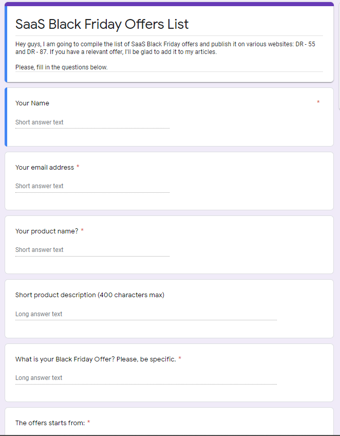 لقد بدأت التحضير قبل ثلاثة أسابيع كاملة من يوم الجمعة الأسود ، وقمت بتجميع استبيان على شبكة الإنترنت من شأنه أن يساعدني في جمع جميع عروض الأعمال B2B التي كان على مجتمعنا تقديمها. بدا الأمر هكذا.