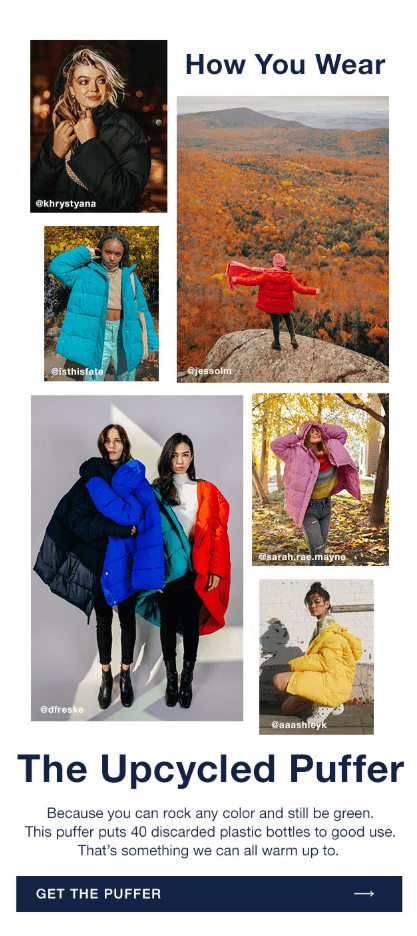GAP هي واحدة من العديد من العلامات التجارية التي تستخدم المحتوى الذي تم إنشاؤه بواسطة المؤثرين كجزء من معسكر البريد الإلكتروني الخاص بهم. نظرًا لأنها علامة تجارية للأزياء ، يكفي مجرد نشر صور المؤثرين الذين يصممون منتجاتهم. لا حاجة لشهادات إضافية أو مراجعات المؤثرين. إنهم يمنحون الأشخاص ما يحتاجون إليه بالضبط - فكرة عن كيفية تصميم منتجات GAP.