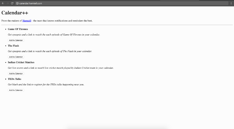 هذا هو. لا توجد صفحة مقصودة. لا يوجد مصادقة. لا CSS حتى. فقط بعض HTML الخام. لكننا كنا مفتونين جدًا بالعثور على هذه التذكيرات الشيقة والأشياء المضافة إلى التقويمات الخاصة بنا والتي ساعدتنا في التخطيط لعطلات نهاية الأسبوع وحياتنا اليومية دون فوضى.