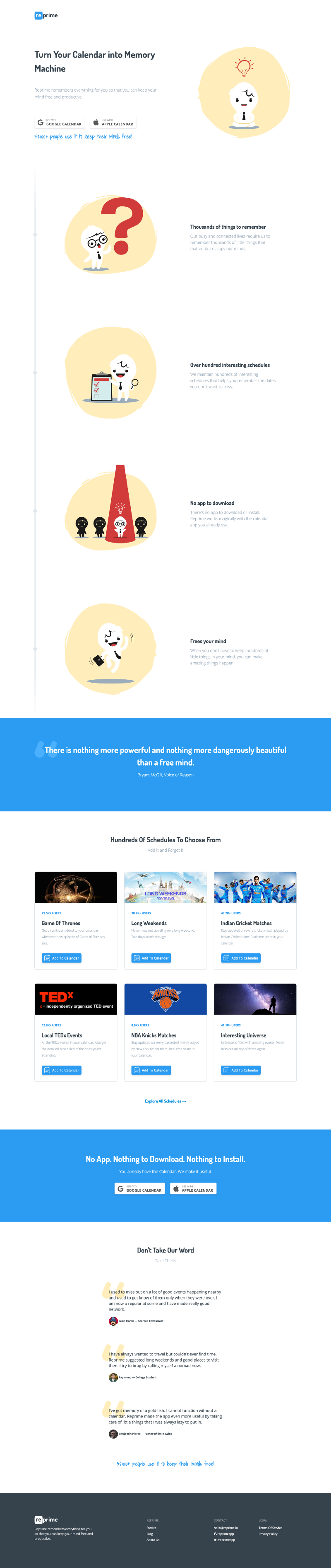 بدءًا من اليوم ، توقفنا عن قبول المستخدمين الجدد عبر صفحة Calendar ++ الخاصة بنا وقررنا قضاء موسم العطلات هذا في ترقية المشروع. لقد أطلقنا عليه اسم Reprime . ويبدو المنزل الجديد شيئًا من هذا القبيل ( الموقع المباشر لا يعمل بعد. نحن نبني في الأماكن العامة ):