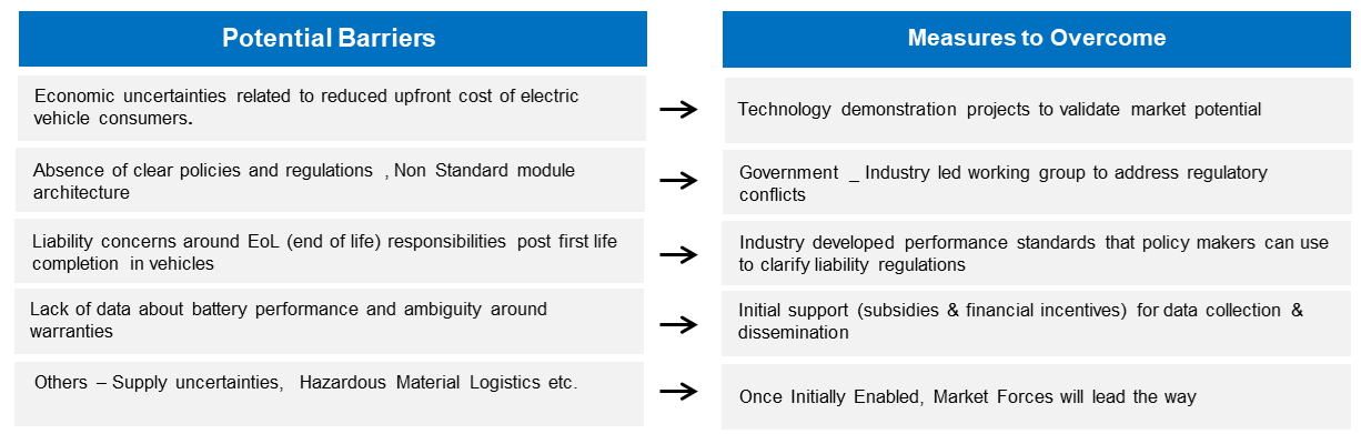 على الرغم من أن العديد من الشركات في جميع أنحاء العالم بدأت ترى إمكانات هذا النهج ، إلا أن القيمة المتبقية لبطاريات العمر الثاني يمكن أن تساعد في خفض التكلفة الأولية حيث أن شركات صناعة السيارات والمستهلكين على حد سواء عامل في قيمة إعادة البيع كجزء من انخفاض سعر الشراء ، ومع ذلك فإن أكبر صانع للمركبات الكهربائية تظل TESLA Motors على الهامش وتركز على استعادة المواد الخام قائلة إن البطاريات ربما لن تكون مناسبة لمهمة جديدة بعد 10-15 عامًا من الاستخدام. استنادًا إلى مشاريع العمر الافتراضي لبطاريات xEVs العالمية ، تم تحديد بعض العوائق الرئيسية التالية: