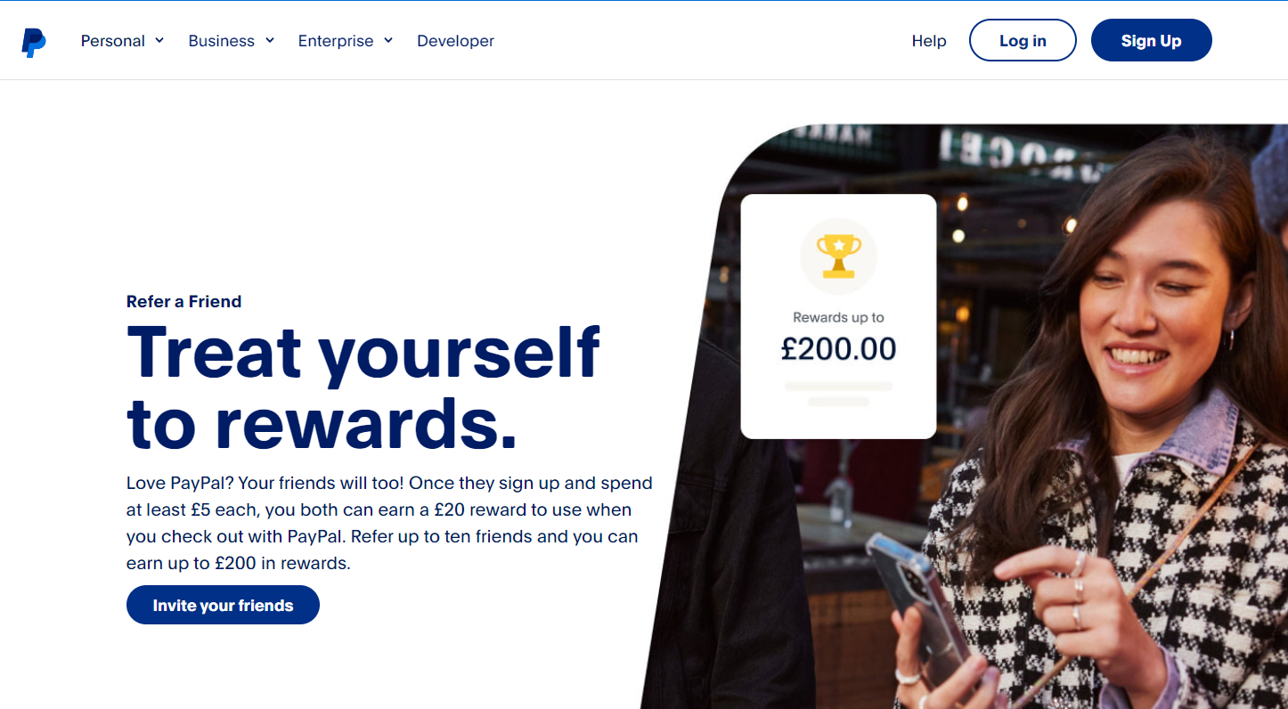 يعد PayPal أحد رواد برامج الإحالة، حيث كان من أوائل البرامج التي تقدم مكافآت مقابل دعوة الأصدقاء. يقدم مكافأة مزدوجة بقيمة 10 دولارات في كل مرة يقوم فيها عضو محال جديد بالتسجيل.