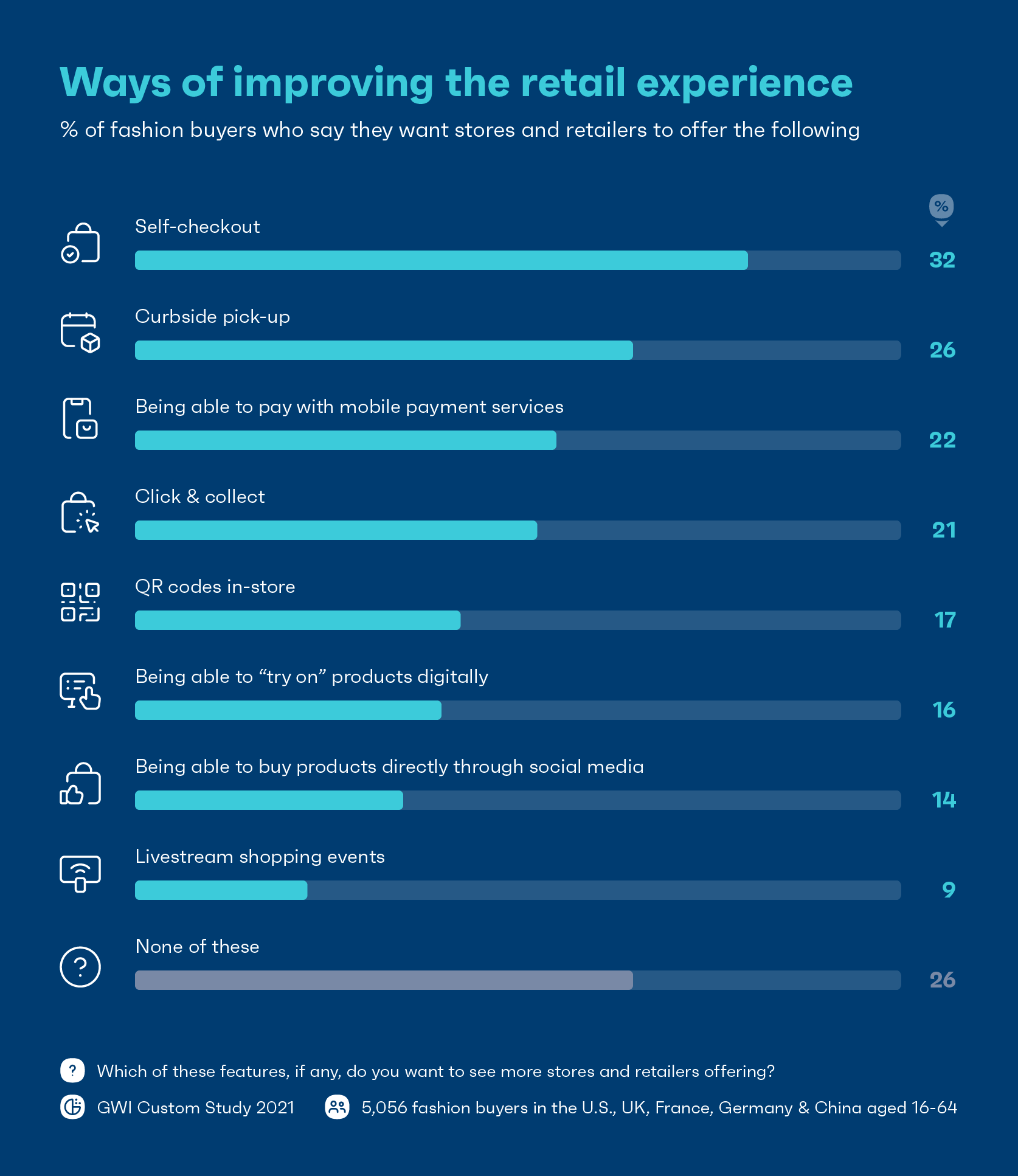 ثلاثة أرباع متسوقي الأزياء يريدون من تجار التجزئة تقديم المزيد من الحلول الرقمية ، مع تسجيل المغادرة الذاتي (32٪) ، والاستلام على جانب الطريق (26٪) ، وتوافق الدفع عبر الهاتف المحمول (22٪) على رأس القائمة. يتم تحمل الكثير من هذا من خلال مخاوف تتعلق بالسلامة أو الراحة ، أو مزيج من الاثنين معًا.
