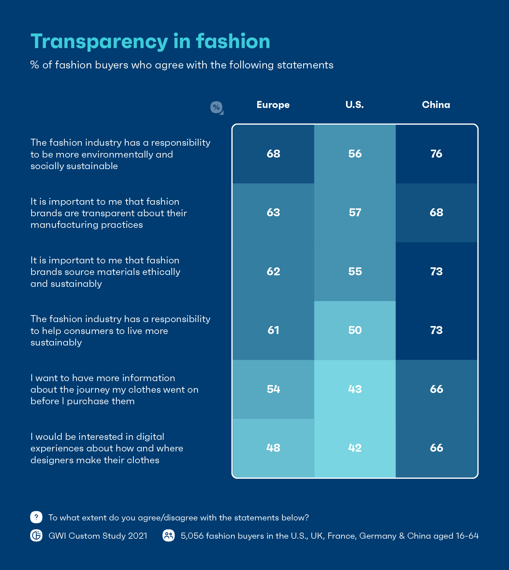 يعبر مشترو الأزياء عن اهتمامهم القوي بالشفافية في تصنيع وحركة منتجاتهم ، وليس فقط أولئك الذين لديهم اهتمام راسخ بالاستدامة هم من يطلبون ذلك. أكثر من 40٪ في الولايات المتحدة ، وأكثر من 50٪ في أوروبا ، وحوالي 70٪ في الصين يقولون إنهم يريدون مزيدًا من المعلومات حول الرحلة التي مرت بها ملابسهم قبل الشراء.