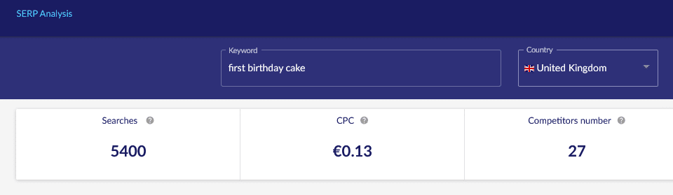 كل هذه البيانات متاحة في SERP Analysis ، وهي وحدة نمطية جديدة متاحة في تطبيق Senuto. كيف يعمل؟ أدخل الكلمة الرئيسية المستهدفة - على سبيل المثال ، "كعكة عيد الميلاد الأولى" هي كلمة رئيسية قوية للأعمال إذا كنت تدير متجرًا للكعك - للحصول على تقرير يغطي أفضل 20 نتيجة بحث من Google ، وهذا هو أول اثنين من نتائج SERP (يتم فهرستها 10 قوائم لكل منهما).