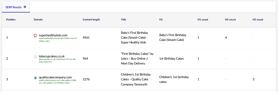 انظر أدناه لمشاهدة أداء قادة SERP للكلمة الرئيسية "كعكة عيد الميلاد الأولى" - متوسط طول النص ، وعدد الرؤوس ، وما إلى ذلك.