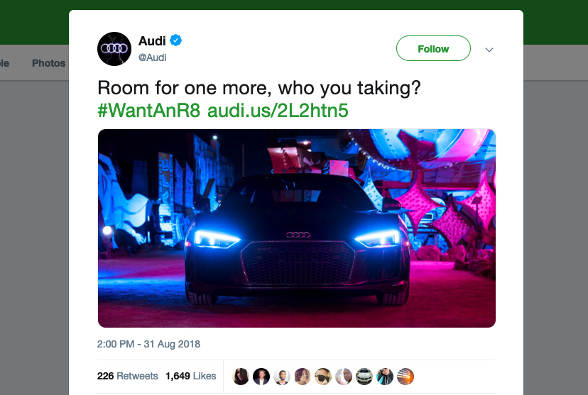 استفادت أودي ذات مرة من علامة تصنيف أنشأها أحد المعجبين على تويتر باسم # WantanR8. فاجأوا مستخدم Twitter بالسماح لها بقيادة سيارة R8 ليوم واحد ، ثم استخدموا علامة التصنيف للترويج للسيارة وتقديم المزيد من المشاوير المجانية لمحبي Twitter.