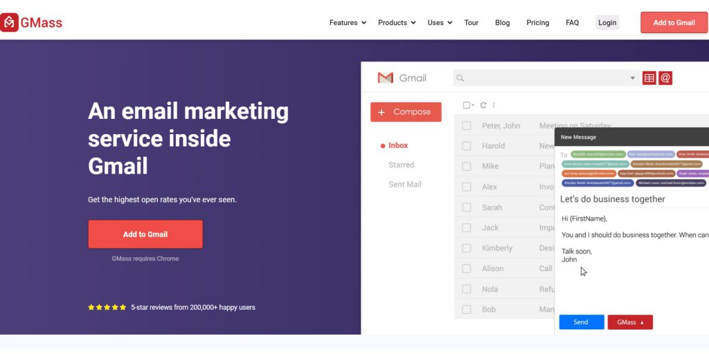 GMass هو برنامج بريد إلكتروني بارد يتيح لك تشغيل حملات المبيعات والتسويق مباشرة من حساب Gmail الخاص بك. لديها إمكانيات دمج البريد مما يجعلها أداة رائعة لمسوقين البريد الإلكتروني.