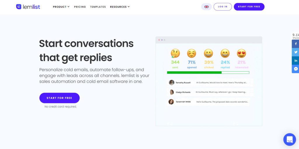 Lemlist هو برنامج شامل للبريد الإلكتروني وأتمتة المبيعات يتيح لك أتمتة عمليات المتابعة وتخصيص رسائل البريد الإلكتروني الباردة والتفاعل مع العملاء المتوقعين عبر جميع القنوات.