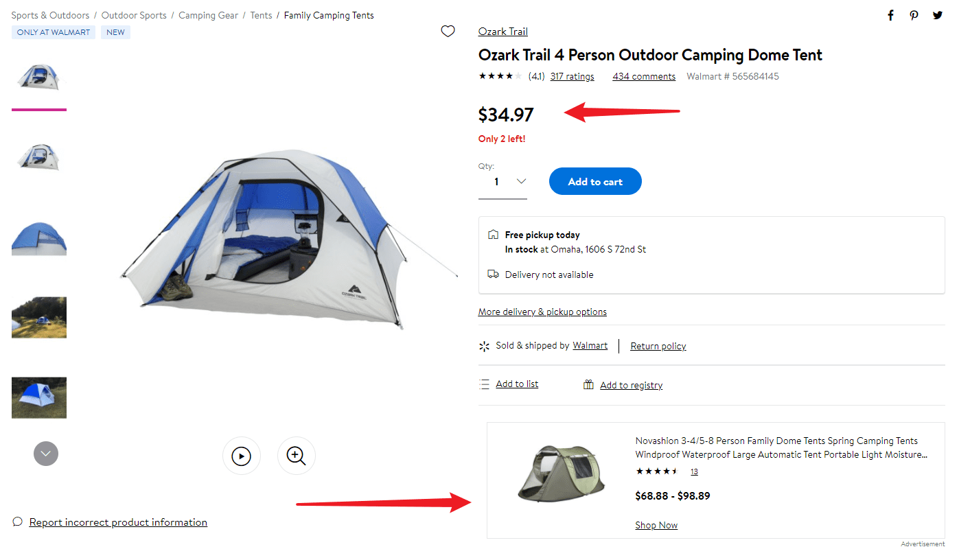 لاحظ كيف يدمج Walmart البيانات التي تم إنشاؤها بواسطة المستخدم في عنصر واجهة المستخدم للمساعدة في التحقق من صحة الميزة الإضافية عن طريق الترقية إلى العنصر الأعلى سعرًا.