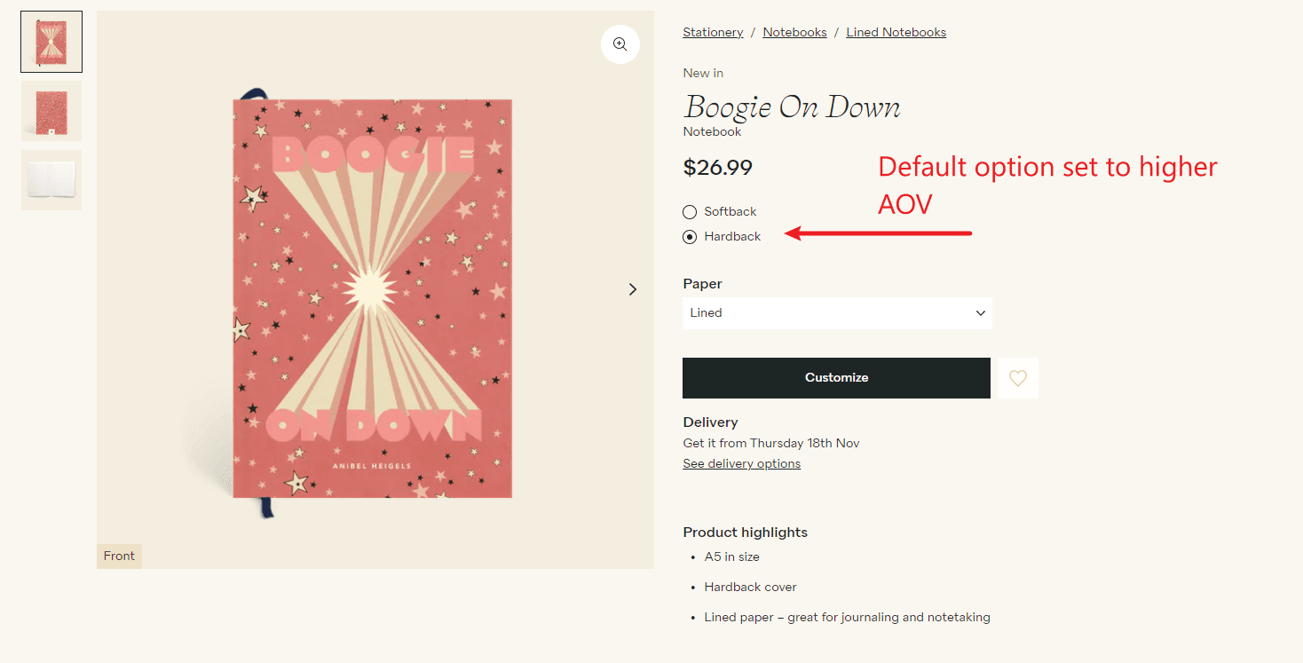 أعلاه ، نرى أن هذا يستخدم لتأثير كبير. في حين أن دفاتر Papier يمكن أن تأتي في كل من لينة و Hardback ، فإن الافتراضي هو العرض الأكثر تميزًا قليلاً. يؤدي إلغاء الاشتراك إلى إجبار العميل على اختيار منتج غير مرغوب فيه ، ويفرض الاحتكاك ، ويخفي "توفير السعر" لاختيار خيار softback.