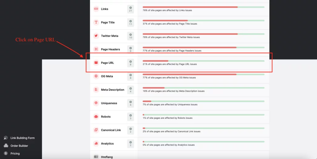 بعد تشغيل تدقيق موقعك ، انتقل إلى علامة التبويب "المشكلات" في لوحة معلومات "مدقق الموقع".