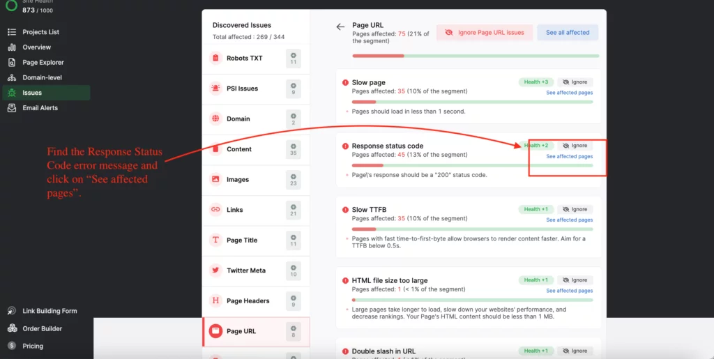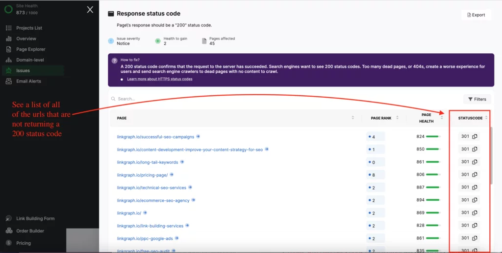 سيتحقق مدقق موقع SearchAtlas من رموز استجابة HTTP لصفحات الويب الخاصة بك. كما سيُعلِم أيضًا أي مشكلات يحددها فيما يتعلق برمز الحالة.