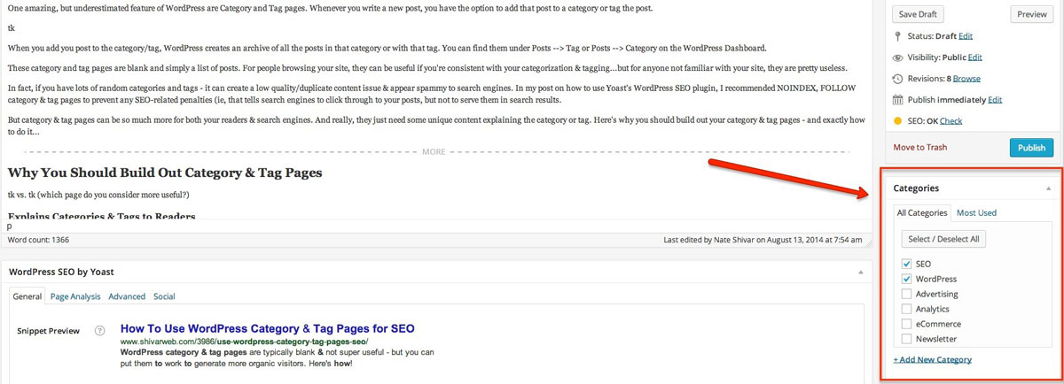 قبل نشر أي محتوى لموقعك ، قم بإنشاء الهيكل التنظيمي أولاً. هذا يلغي متطلبات اتجاهات الصفحة عند تغيير العلامات والفئات الفرعية والفئات الموجودة. إذا كان البحث عن الكلمات الرئيسية الخاصة بك جيدًا ، فيمكنك استخدام الفئات والعلامات لضمان رؤية محسنة لمشاركاتك. يجب ألا تستخدم أكثر من خمس إلى 10 فئات لموقعك وإلا فسيصبح معقدًا للغاية.