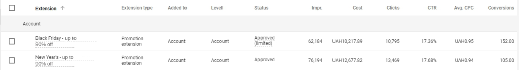 Während der Verkaufssaison Black Friday 2017 haben wir beispielsweise mit dieser Erweiterung hervorragende Ergebnisse erzielt: Die CTR erreichte 17 %.