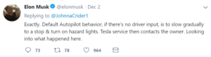 Er sagte auch, dass der Autopilot zwar derzeit keine Einsatzfahrzeuge erkennen kann, dies aber in Zukunft tun könnte.