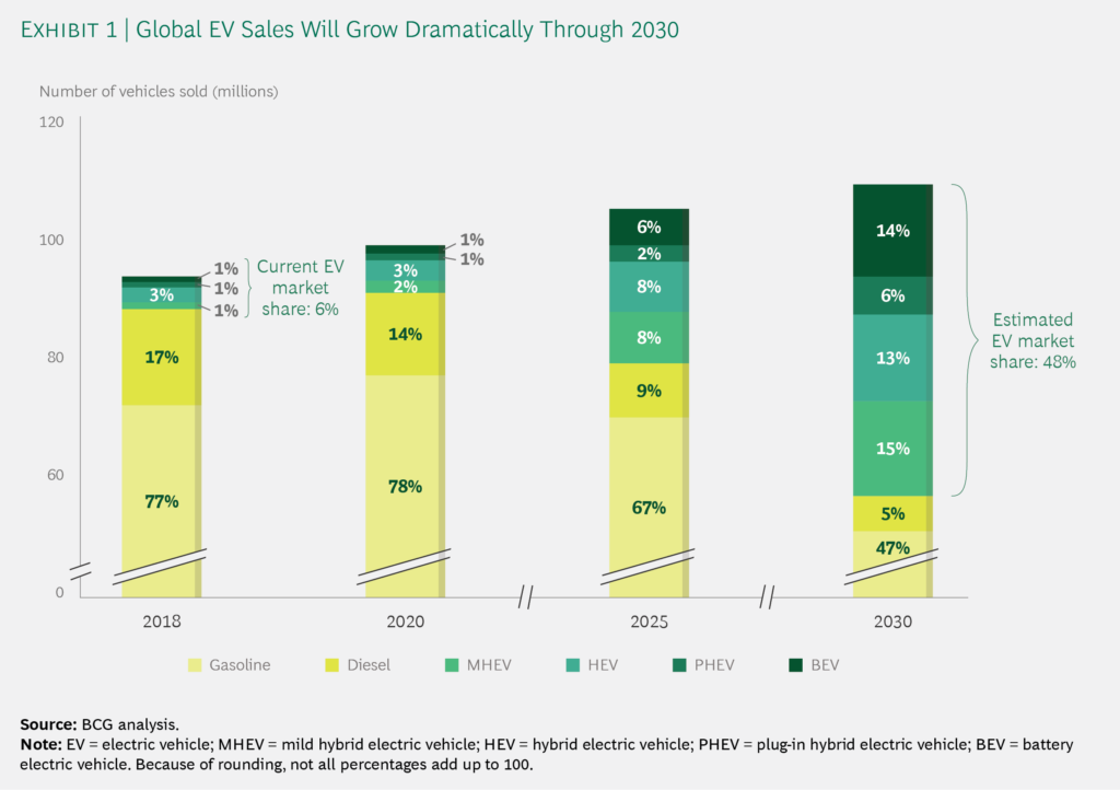 Die Verkäufe sind im Jahr 2018 gestiegen, da Tesla Schwierigkeiten hat, mit der Nachfrage nach seinem Model 3 Schritt zu halten, aber dennoch machen Elektrofahrzeuge weniger als 6 % des gesamten weltweiten Autoabsatzes aus. Laut dem Branchenbeobachter Boston Consulting Group wird der globale EV-Markt jedoch bis 2030 dramatisch wachsen und einen Marktanteil von 48 % einnehmen.