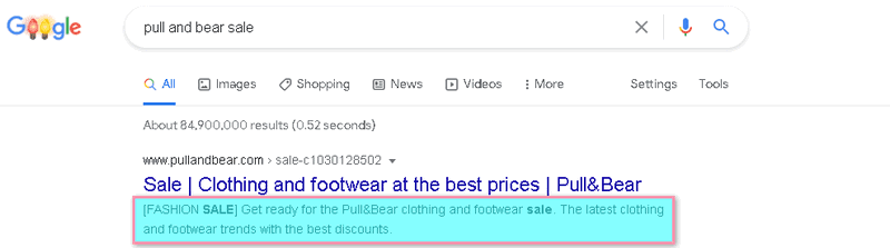 Wenn Sie einen Online-Shop besitzen, machen Sie auf die Meta-Beschreibung von Pull&Bear aufmerksam. Hier sehen Sie einen Call-to-Action. Die neuesten Kleidungstrends und die besten Rabattvorschläge. Es verdient einen Klick auf die Seite.