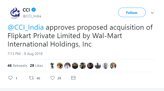 In einem offiziellen Tweet gab die Competition Commission on India (CCI) bekannt, dass sie die lang erwartete Fusion von Flipkart und Walmart endgültig genehmigt hat. Im Mai erwarb der US-Einzelhandelsriese Walmart für 16 Milliarden US-Dollar eine 77-prozentige Beteiligung am indischen E-Commerce-Unternehmen Flipkart, was als das größte E-Commerce-Geschäft der Welt galt.