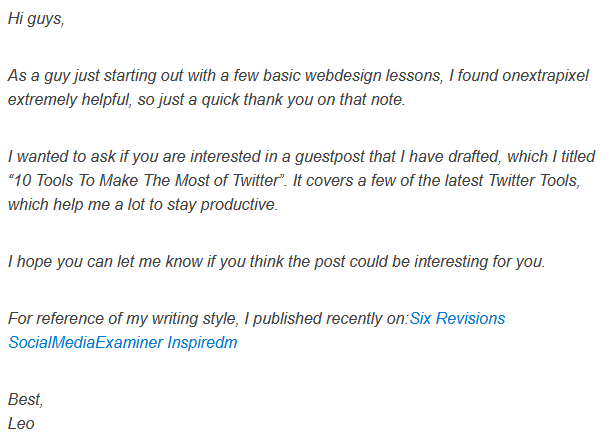 Leo erhielt Möglichkeiten für Gastbeiträge auf Plattformen wie BloggerLinkUp und MyBlogGuest . Als Buffer wuchs, wandten sie sich direkt an Autoritätsseiten, indem sie den Herausgeber der Beiträge ausfindig machten und ihm eine Nachricht hinterließen.