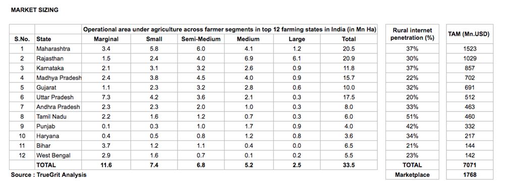 Der Geek in mir hat eine kleine Markteinschätzung durchgeführt und herausgefunden, dass der Total Addressable Market (TAM) für einen Online-Marktplatz für Agrar-Inputs in Indien bei etwa 1,8 Mrd. USD liegt (Gesamtmarkt für Agrar-Inputs = 7 Mrd.+).