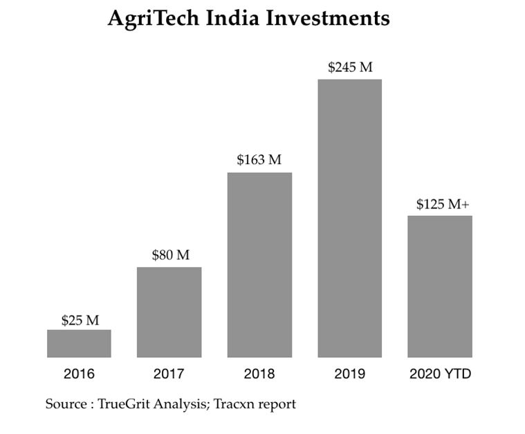 Indien ist die Heimat von mehr als 500 Agritech-Startups, die jährlich um 25 % wachsen. Diese Startups sammelten 2019 insgesamt rund 250 Millionen US-Dollar an Risikokapital, was dem Dreifachen des Gesamtbetrags entspricht, der 2018 in den Sektor investiert wurde. Es wird prognostiziert, dass der Sektor in den nächsten Jahren mehr als 500 Millionen US-Dollar an Finanzmitteln anziehen wird. Aavishkaar, Accel, Ankur Capital, Beenext und Omnivore waren die ersten Investoren in diesem Sektor. In jüngerer Zeit haben wir gesehen, dass Fonds wie Blume, Nexus, Sequoia, Tiger Global und RTP ebenfalls in den Sektor investieren.