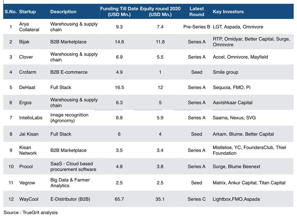 Im Jahr 2020 (Jahr bis heute) haben mehr als 20 Agritech-Startups insgesamt mehr als 125 Millionen US-Dollar über Eigenkapital, Venture Debt und konventionelle Kreditrunden aufgebracht. Einige der bemerkenswerten Equity-Runden sind in der folgenden Tabelle aufgeführt: