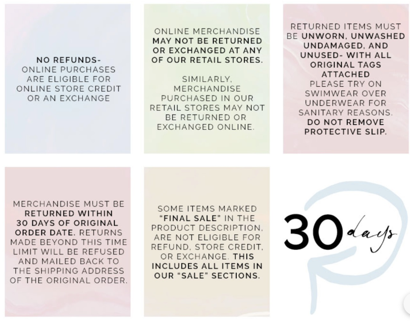 San Lorenzo Bikini tut dies auf seiner Seite mit den Rückgaberichtlinien sehr gut. Sie verwenden Design und eine klare Sprache, um ihre Politik zu kommunizieren.