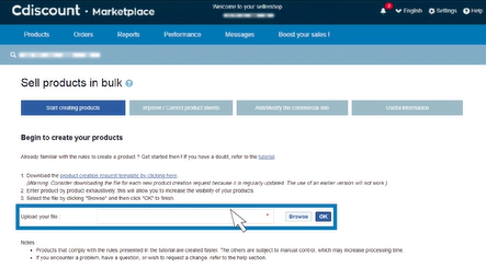 Sobald die Produkterstellungsanforderungsdatei jedoch fertiggestellt ist, können Sie sie von derselben Seite in Ihrer Verkäuferzone hochladen. Es wird dann von Cdiscount bearbeitet und Ihre Produkte werden innerhalb weniger Stunden in unserer Datenbank eingetragen.
