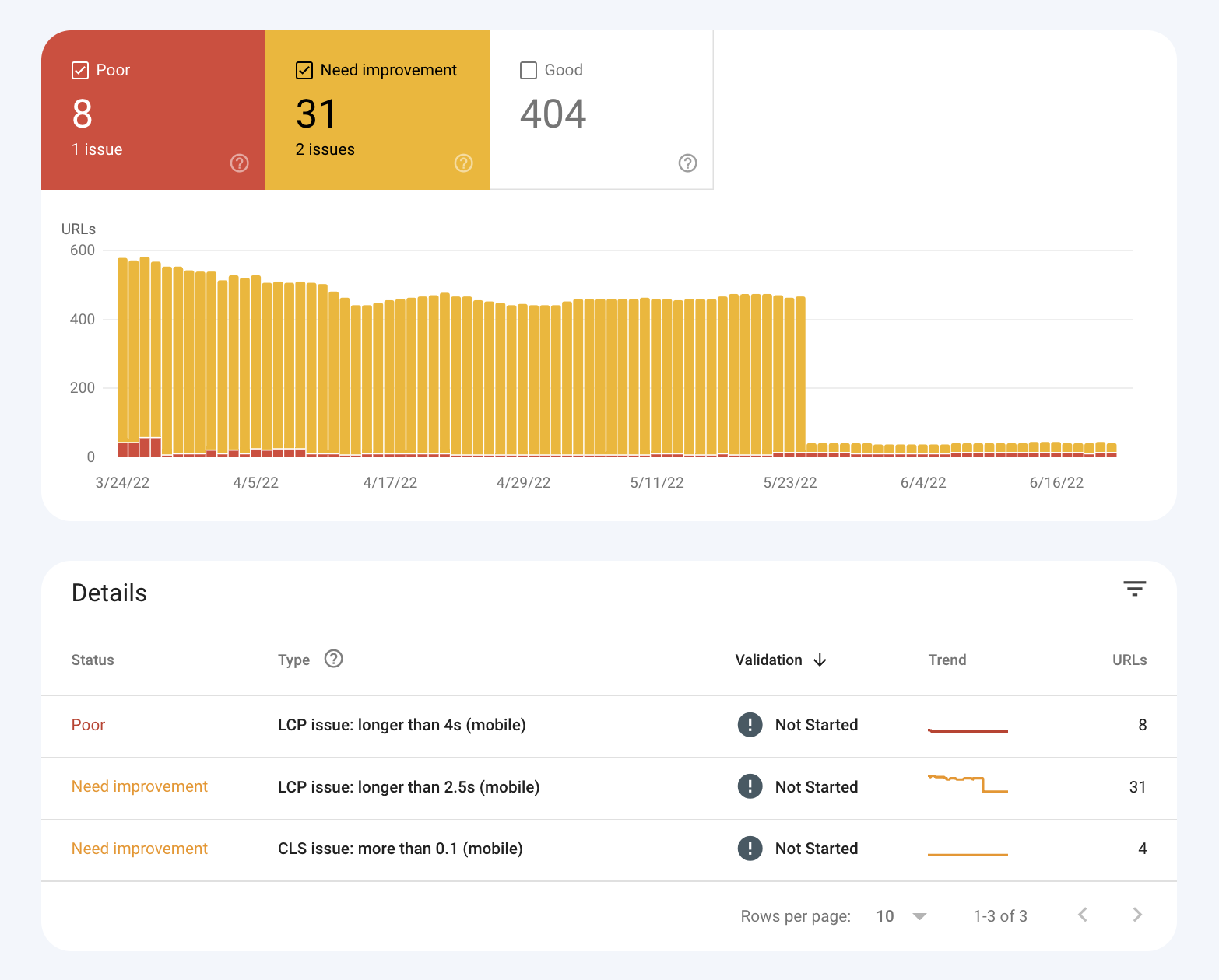 Diese beiden Berichte unterscheiden sich fast immer, da unterschiedliche Prinzipien für das Design und die Funktionalität von Mobilgeräten und Desktops gelten. Wenn Sie den Core Web Vitals-Bericht öffnen, wird Ihnen ein detailliertes Diagramm der Fehler angezeigt: