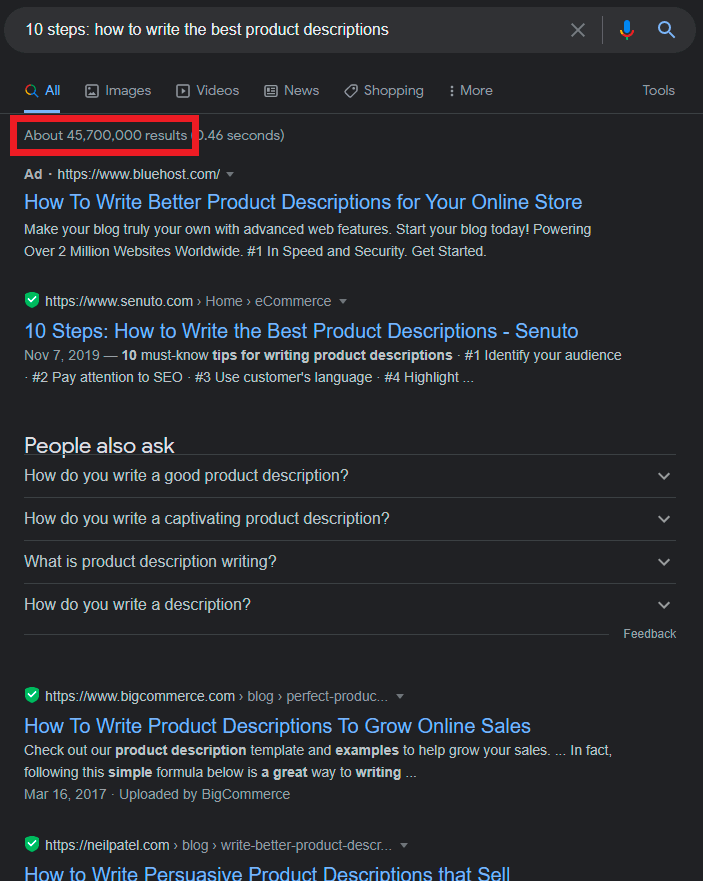 Im Gegensatz zur normalen Suche zeigt eine genaue Übereinstimmung nur Ergebnisse an, bei denen das Schlüsselwort in der gleichen Form wie in den Anführungszeichen erscheint. Dieser Operator ist besonders nützlich, wenn Sie auf der Seite nach doppelten Inhalten suchen , die sich negativ auf Ihr Ranking auswirken können (mehr dazu gleich).