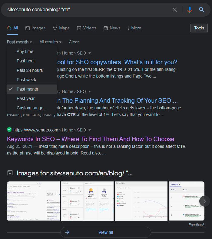 Um meine Suche nur auf den Blog zu beschränken, werde ich die Unterseite senuto.com/en/blog allein statt der gesamten Seite betrachten. Der Unterschied besteht darin, dass die CTR 21 Mal auf der gesamten Website und nur in 19 Ressourcen im Blog erwähnt wird. Ich kann den Datumsfilter verwenden (klicken Sie auf Werkzeuge und wählen Sie den Datumsfilter), um zu überprüfen, was im letzten Monat veröffentlicht wurde. Hier sind die Ergebnisse:
