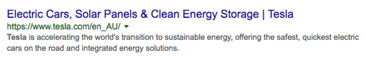 Tesla lo mantiene breve y dulce con su meta. En solo 22 palabras, lograron usar palabras clave de enfoque y compartir una cantidad notable de información útil sobre la empresa. Una meta descripción como esta seguramente aumentará el interés y alentará a los consumidores a hacer clic en el sitio, al mismo tiempo que es compatible con los motores de búsqueda.