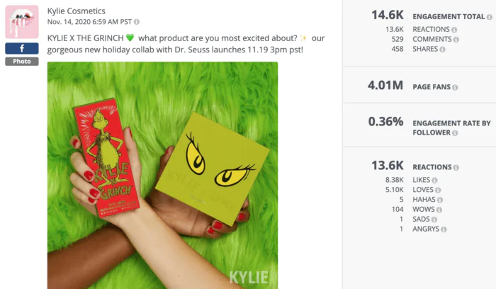 Kylie Cosmetics muestra videos e imágenes de los fanáticos en Twitter, Instagram y Facebook. Etiquetan al individuo, usan hashtags específicos del producto e incluso retuitean mensajes de personas que publican sobre varios productos.