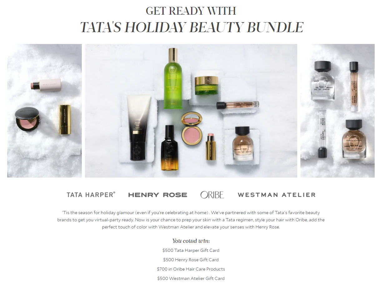 Tata Harper agrupa productos de varias marcas para crear un atractivo paquete de premios. Luego, desarrollan una página de destino de la marca, y cada persona que ingresa se registra automáticamente en la lista de correo electrónico de Tata Harper con boletines y ofertas especiales.