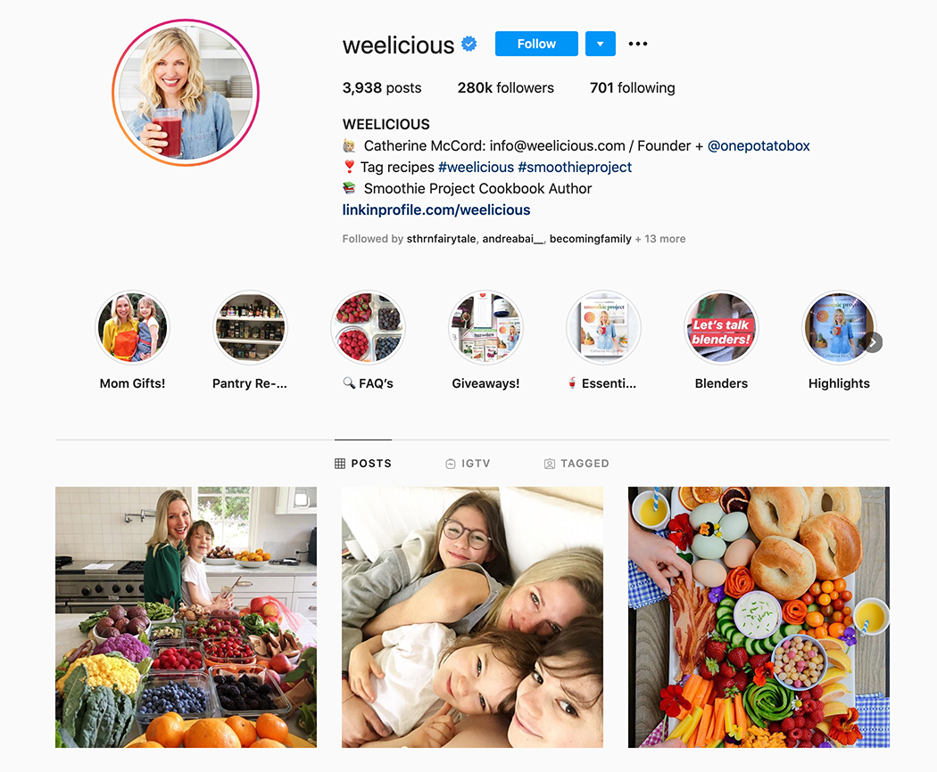 Catherine McCord tiene un título de escuela culinaria y lo puso a trabajar después de tener a su primer hijo. No pudo encontrar recetas simples, nutritivas y sabrosas para su bebé, por lo que asumió la tarea y luego se hizo conocida por sus creaciones en loncheras. Amplió su presencia en las redes sociales para abordar las necesidades a la hora de comer de toda su familia, que ahora consta de tres hijos. Weelicious en Instagram tiene 27.600 seguidores y ella tiene 20.300 suscriptores en YouTube.