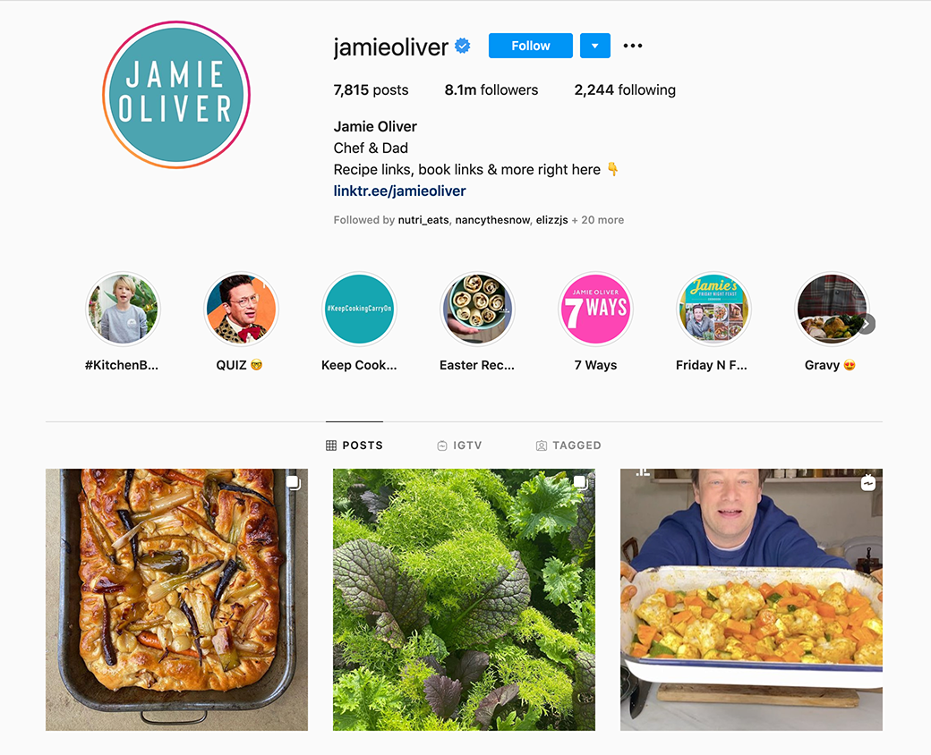 Jamie Oliver es un famoso chef británico que se especializa en la preparación de comidas saludables y cocina divertida y accesible para niños y padres por igual. Ha presentado varios programas de televisión tanto en los Estados Unidos como en el extranjero. Su programa "Food Revolution" en 2010 se centró en enseñar a un pueblo de Virginia cómo cocinar de manera saludable, y es un defensor de los almuerzos escolares saludables. Puedes encontrarlo en las redes sociales preparando una tormenta con su hijo pequeño, Buddy. Tiene 7,3 millones de seguidores en Facebook y 4,9 millones de suscriptores en YouTube.