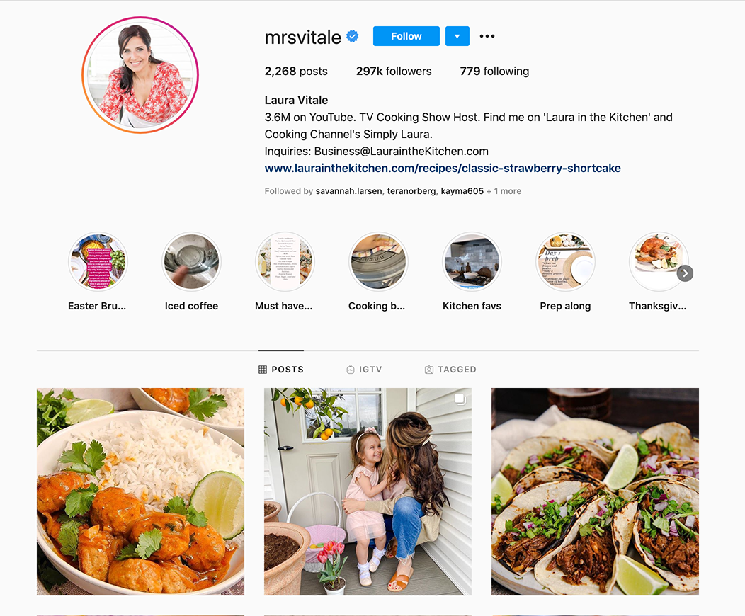 Laura Vitale es una cocinera casera autodidacta que nació en Italia y tiene una gran pasión por la cocina casera italiana. Creció en los restaurantes de su padre, pero su amor por la cocina continuó después de que cerraron. Es una personalidad de YouTube, pero también la presentadora de Simply Laura, un programa de Cooking Channel. Como la mamá de al lado, tiene todo tipo de recetas para comidas familiares gourmet. Su canal, Laura in the Kitchen, tiene 3,62 millones de suscriptores en YouTube.