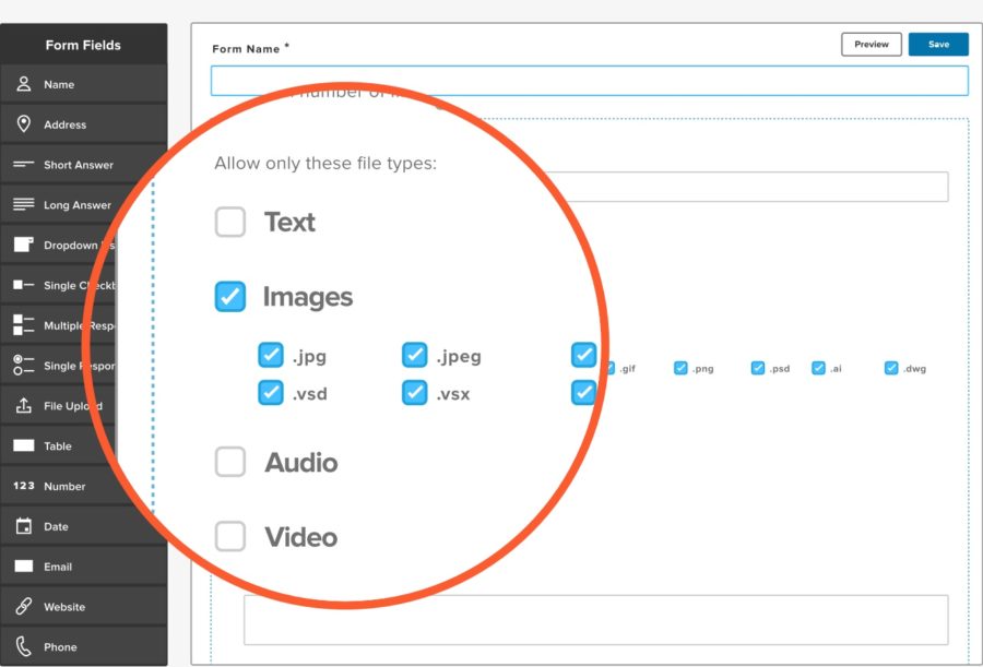 También puede aceptar varios tipos de archivos para que los beneficiarios no tengan que recrear el contenido. Por ejemplo, si tienen un video que crearon para explicar su nuevo programa, permítales enviarlo en lugar de pedirles que escriban toda la misma información.