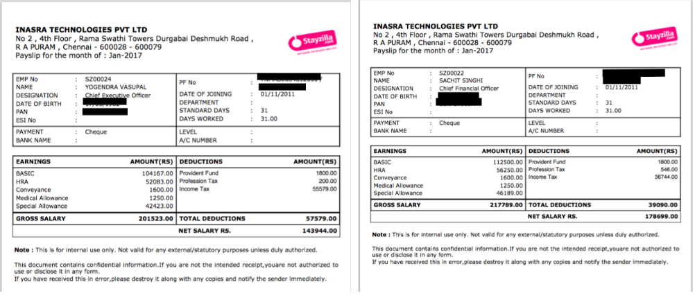 La publicación destaca que los salarios obtenidos por Yogi (INR 201 523 brutos por mes) y Sachit (INR 217 789), a pesar de ser el director ejecutivo y el director financiero, respectivamente, fueron inferiores a lo que ganaban la mayoría de los jefes de departamento de Stayzilla . Continúa afirmando que Yogi y Sachit, a pesar de las repetidas ofertas de los inversores y la presión de los miembros de la familia, no habían cobrado ni una sola acción de su participación en la empresa.