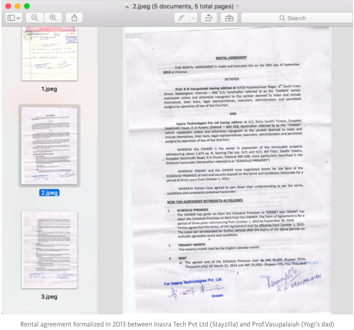 El pago mensual al padre de Yogi es en realidad el alquiler mensual en virtud de un contrato de alquiler del apartamento del padre de Yogi que es el domicilio social de Stayzilla en RA Puram, bajo Inasra Technologies Pvt Ltd desde 2013 hasta la fecha. Esto no se formalizó en los primeros años de ocupación desde 2007 sino que se hizo en 2013 luego de recibidas las inversiones.